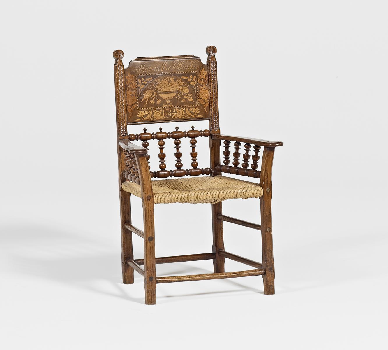 Eiche, Nussbaum, Ahorn u.a. Hölzer, tlw. geschnitzt und eingelegt. Binsensitz. H.92cm. Zustand A/B.