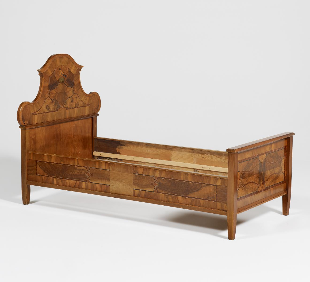 Nussbaum, Pflaume, Ahorn u.a. Hölzer poliert und eingelegt. 130x102x212cm. Zustand B/C.