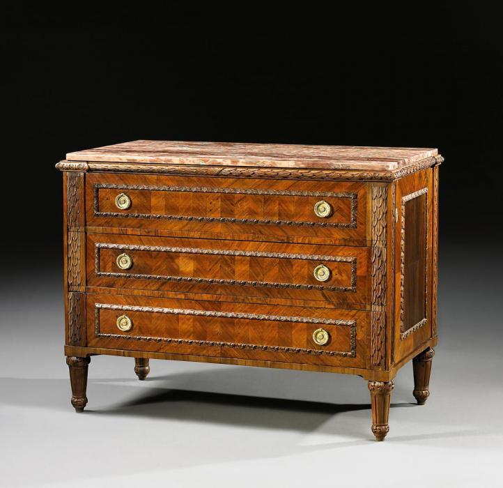 Nussbaum poliert und tlw. beschnitzt. Marmorplatte. 93x123x64cm. Zustand C. Rückwand ergänzt.