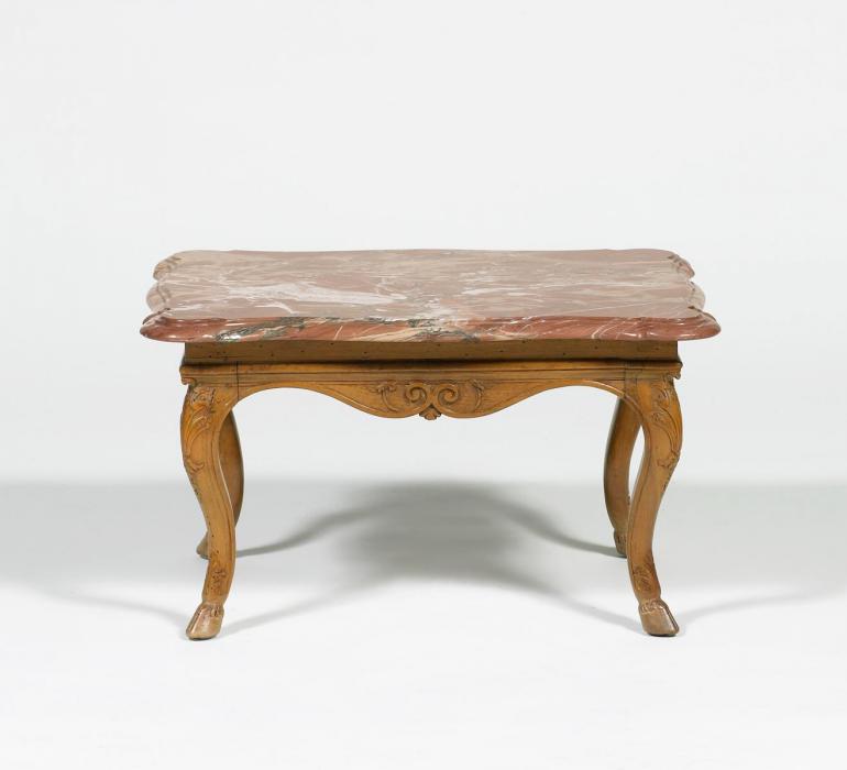Nussbaum geschnitzt. Marmorplatte. 43x62x46cm. Zustand B.