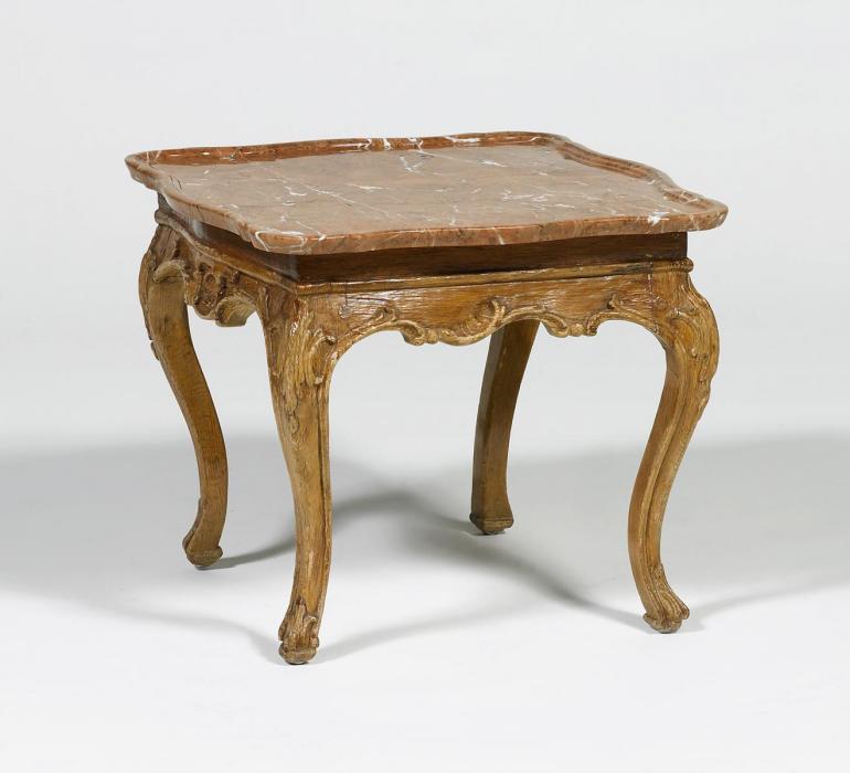 Kleiner Beistelltisch Style Louis XV. Eiche geschnitzt. Marmorplatte. 48x49x52cm. Zustand C.