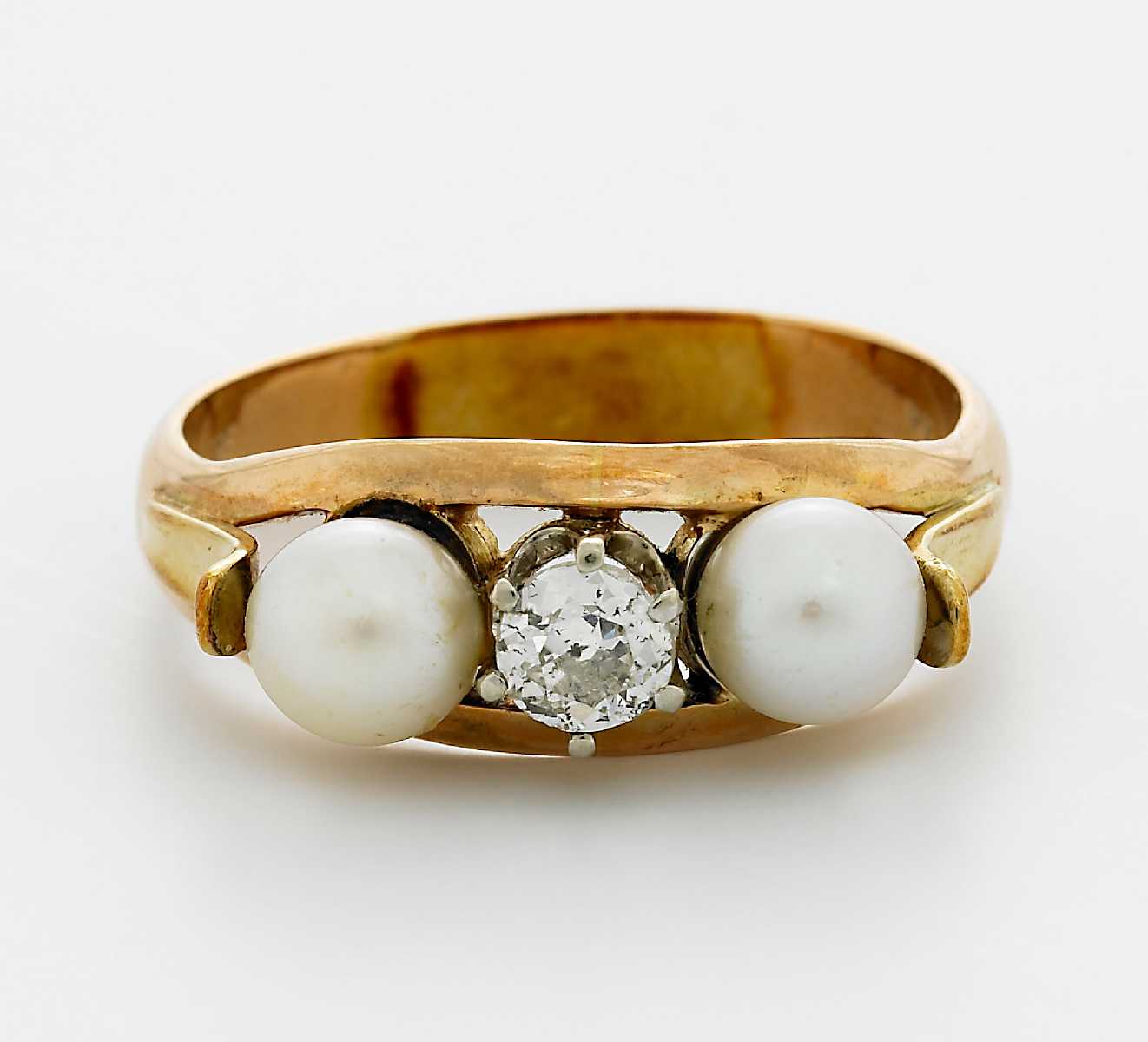 585/- Gelbgold, gestempelt. 6,3g. 1 Brillant ca. 0,35ct, 2 Süsswasser-Zuchtperlen, D. ca. 5,9mm. EU-RM: 67.