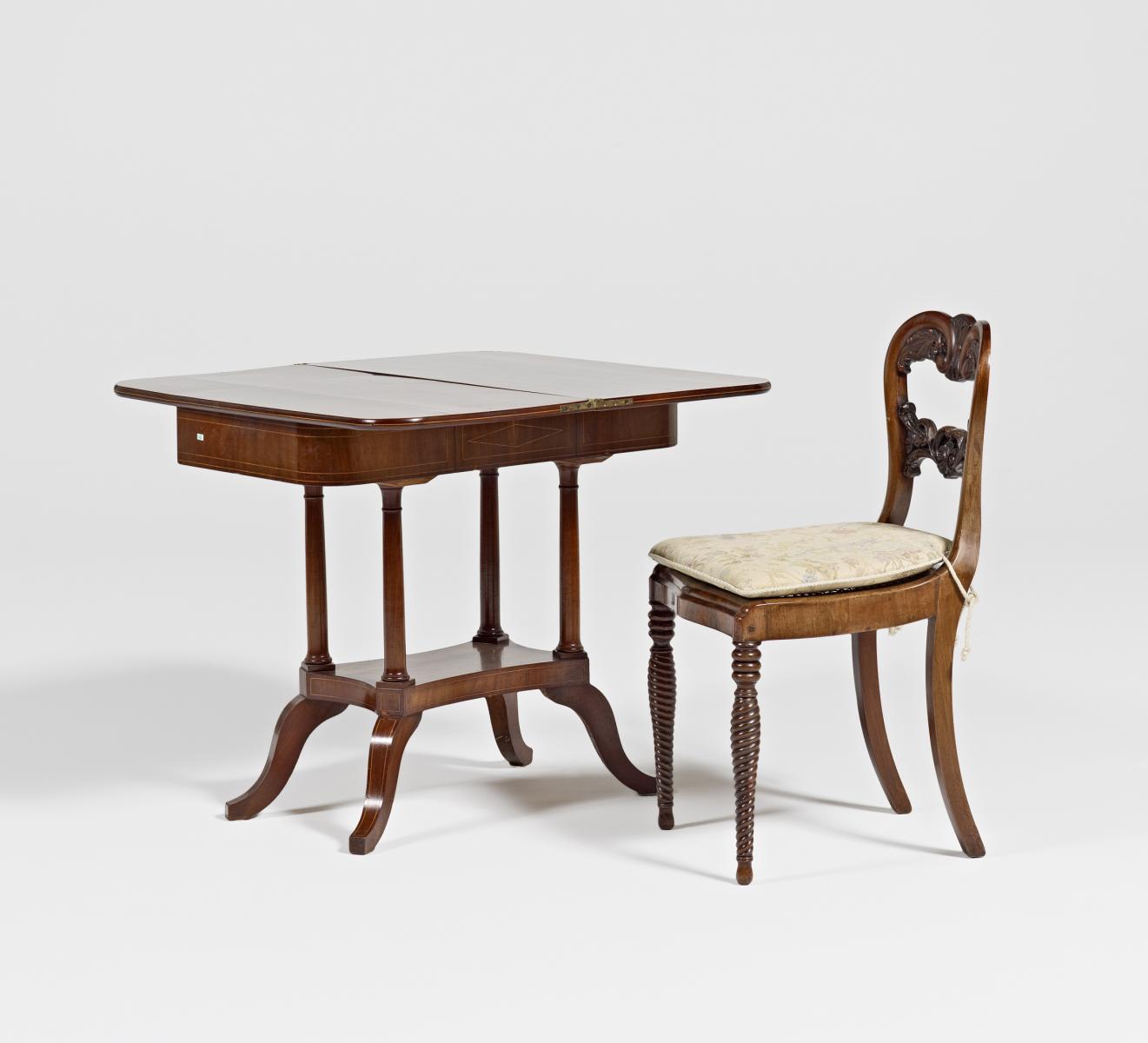 Mahagoni, Ahornfilets. {Beil.:} Stuhl. 76x83x43cm. Zustand C.
