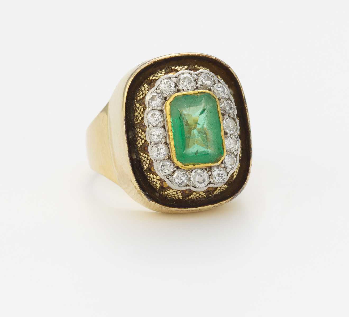 585/- Gelbgold, gestempelt, Silberverbödung. 10,1g. 1 Smaragd im Treppenschliff, zahlreiche Diamanten in Alt- und 8/8-Schliff, EU-RM: 58,5. Ringtop: H x B=19 x 16mm.~