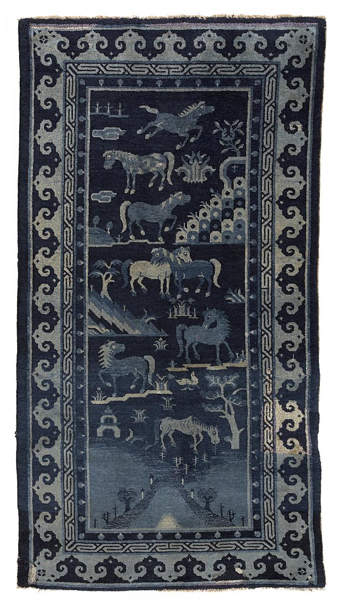 "Die acht Pferde des Kaisers Mu-Wang". Anfang 20.Jh. 175 x 92cm. Zustand C. (Kanten beschädigt, Reparaturen).