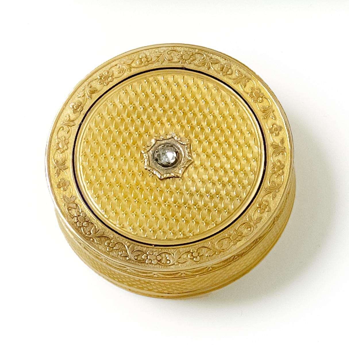 Gelbgold, Email, Diamant. Runde Form. Umlaufende Rahmung mit Girlanden und Blütenranken. Auf Deckel zentral ein