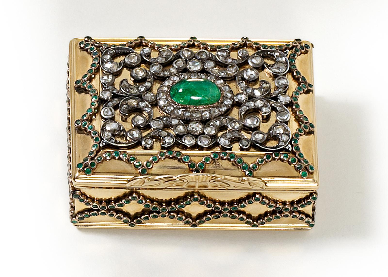 Rotgold, ovaler Smaragdcabochon, 348 kleine Besatzsmaragde Altschliff (zus. ca. 6,96ct), ca. 121 Diamantrosen (zus. ca. 4,25ct). Rechteckige Form mit scharniertem Deckel. An den Seiten aufgesetzte Girlanden aus