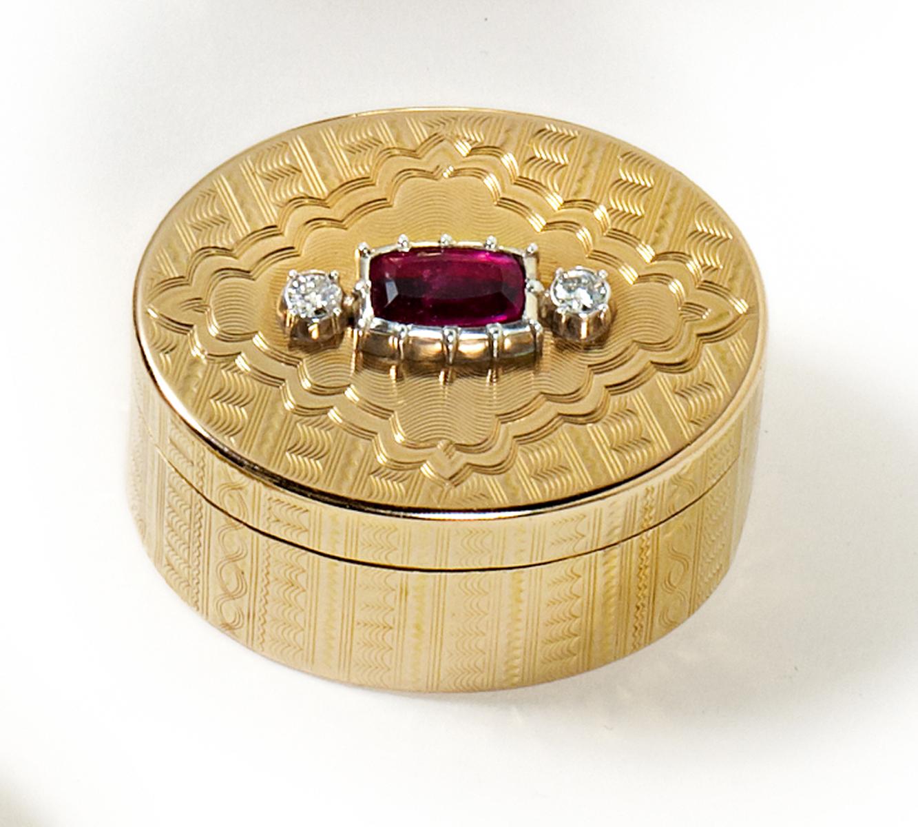 Gelbgold, Rubelith im Fancyschliff, 2 Brillanten (zus. ca. 0,50ct). Ovale Form mit scharniertem Deckel. 3x5,5x4cm. Ca. 56g. Zustand B. Steinbesatz später ergänzt.