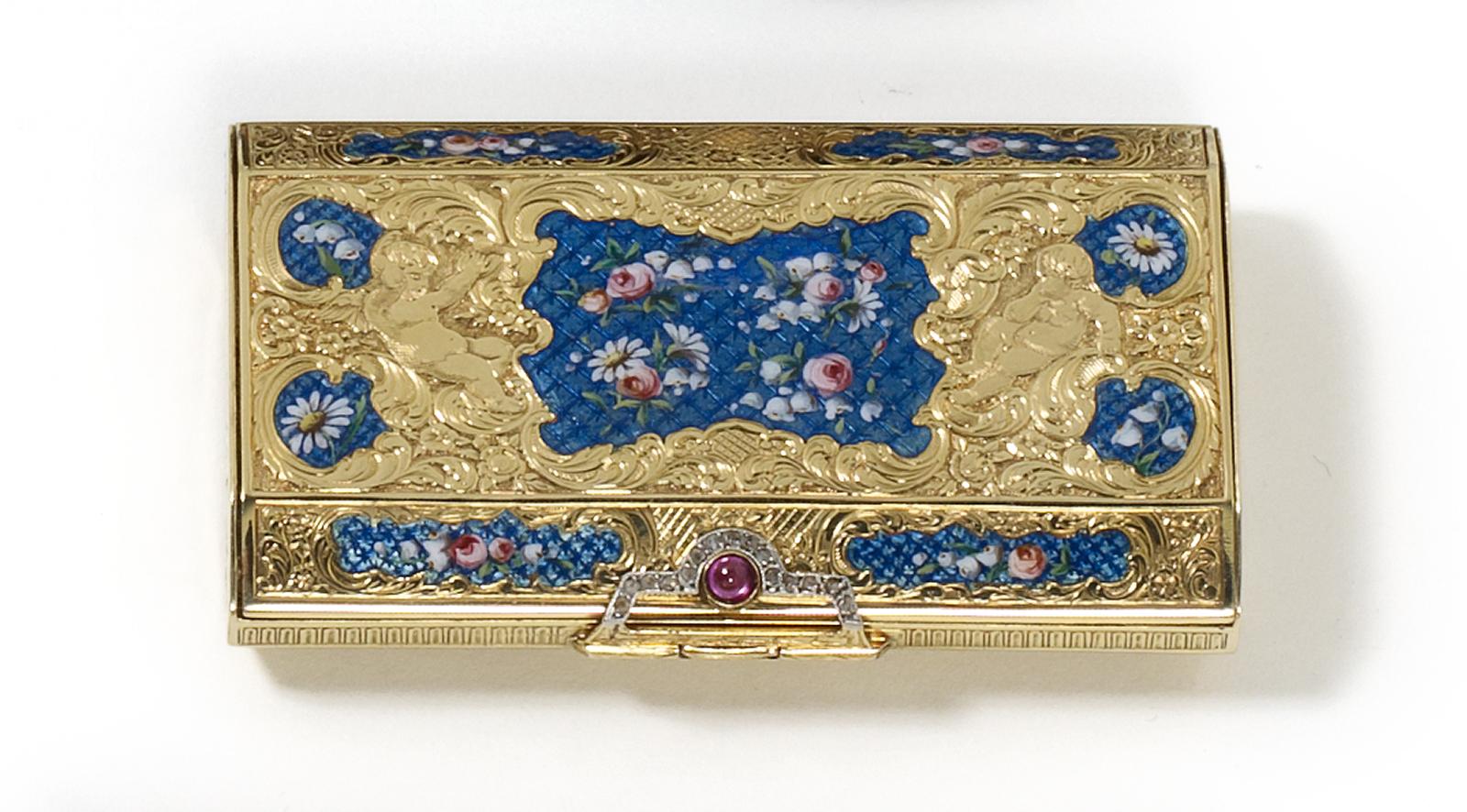 Gelbgold, Email, runder Rubin Cabochon (ca. 0,25ct), 15 kleine Diamantrosen (zus. ca. 0,12ct). Rechteckige Form mit abgeschrägten Kanten und scharniertem Deckel. Floraler Reliefdekor