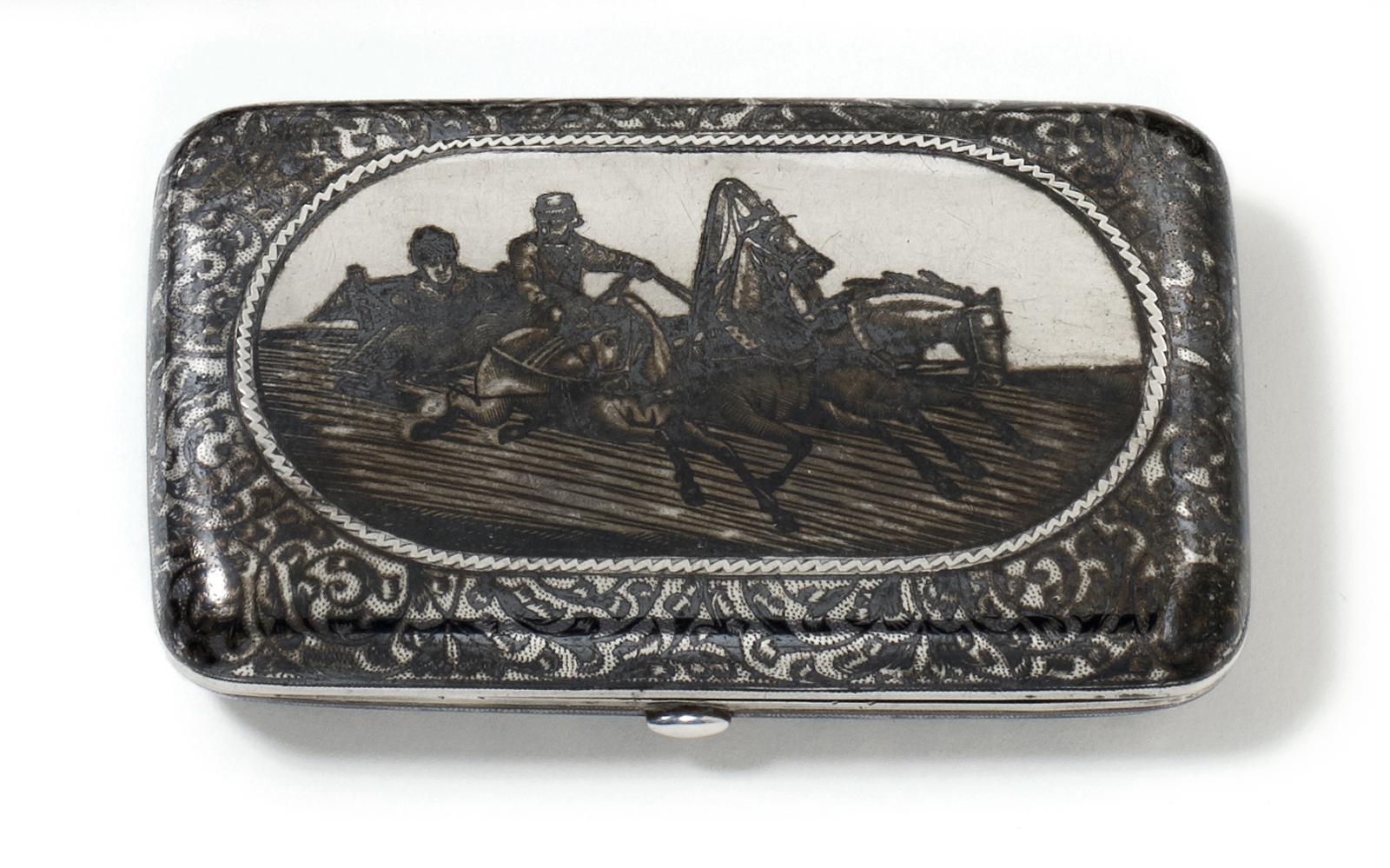 Silber mit Niellodekor, Innenvergoldung. Rückseite mit ligiertem Monogramm L.H.K. 10 x 6,5cm. Ca.132g. Zustand A/B.