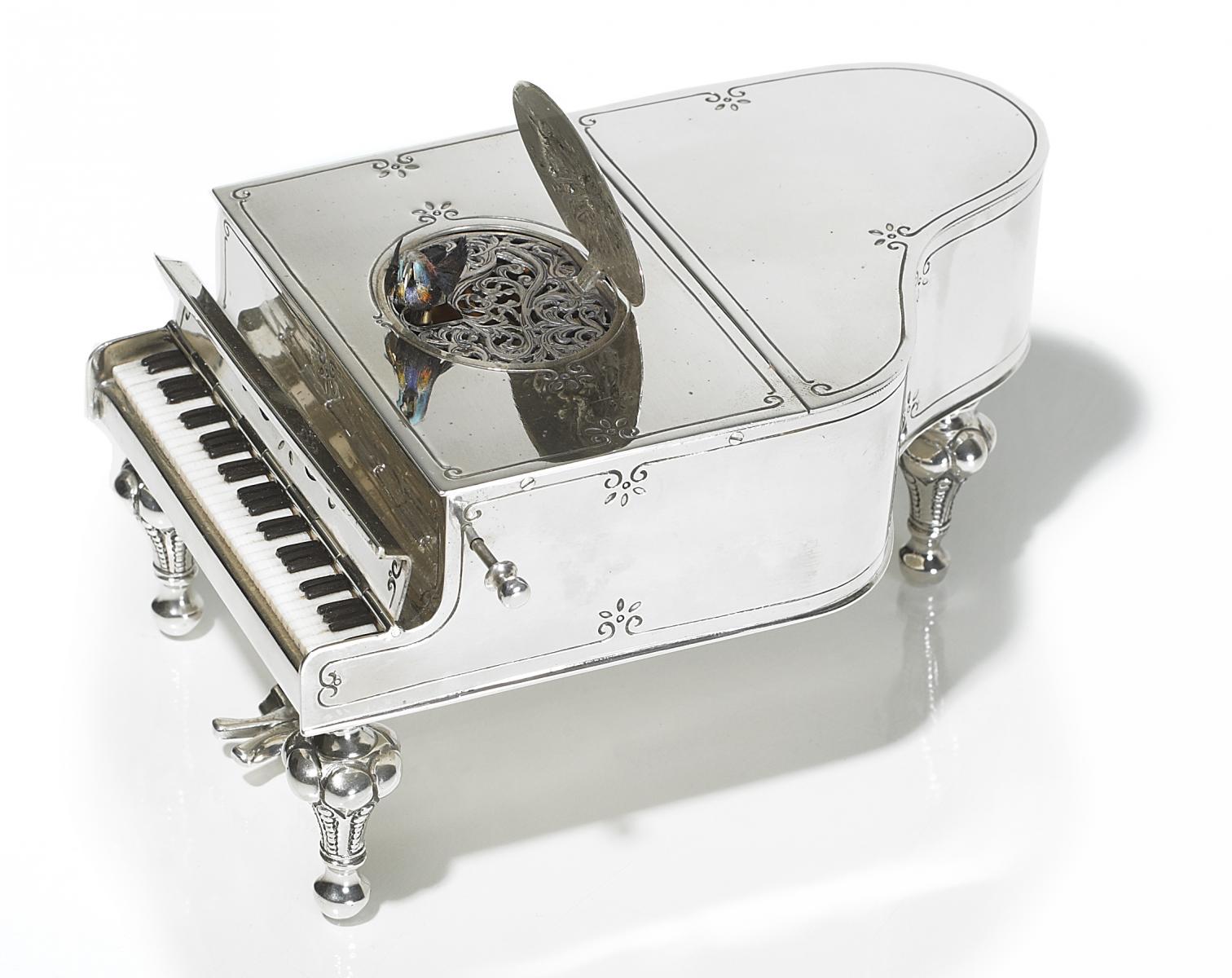 Silber, Bein. Hinterer Teil des Flügels mit aufklappbarem Deckel. Davor ovaler scharnierter Deckel mit
