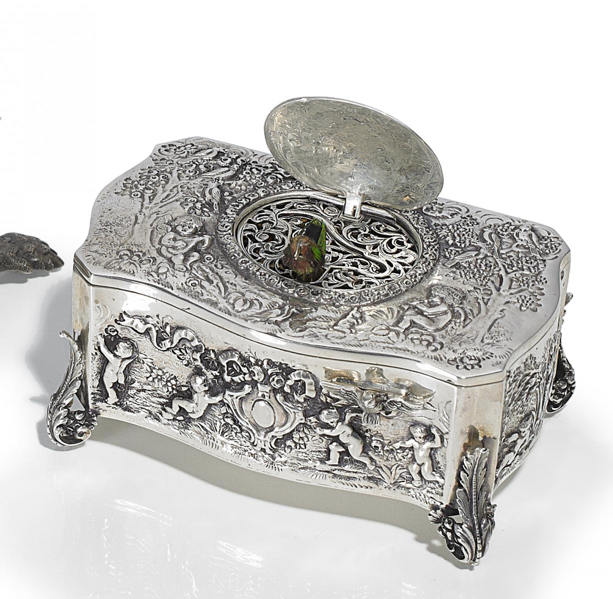 Silber. Passige rechteckige Form mit Reliefdekor. Musizierende Amoretten und Putten in Landschaft.