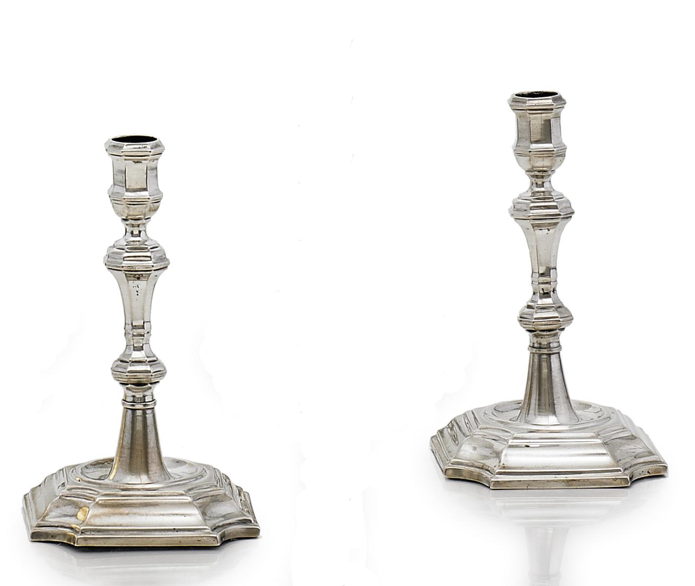 Silber. Quadratischer Fuß mit eingeschwungenen Ecken. Der Balusterschaft mit polygonaler Tülle. Höhe 17,5cm. Ca. 432g. Zustand A/B. bzw. B.