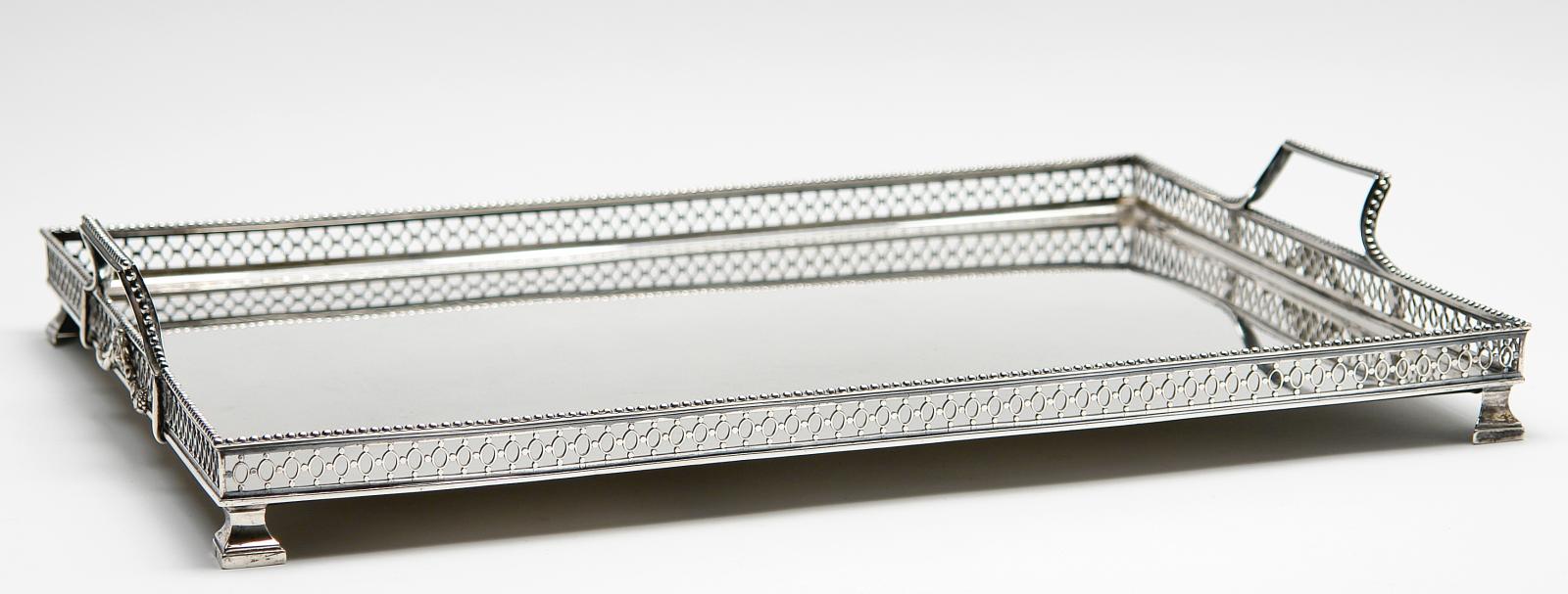 Silber. Rechteckige Handhaben mit Perlzier, darunter auf Galerierand jeweils aufgelegtes Feston. 6,5x46x33,5cm. Ca. 2703g. Zustand A/B.