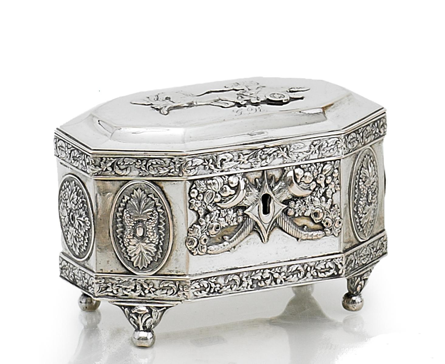 Silber. Auf Deckeloberseite Monogramm 'G.R.'. 11,5x16,5x11cm. Ca. 862g. Zustand C.
