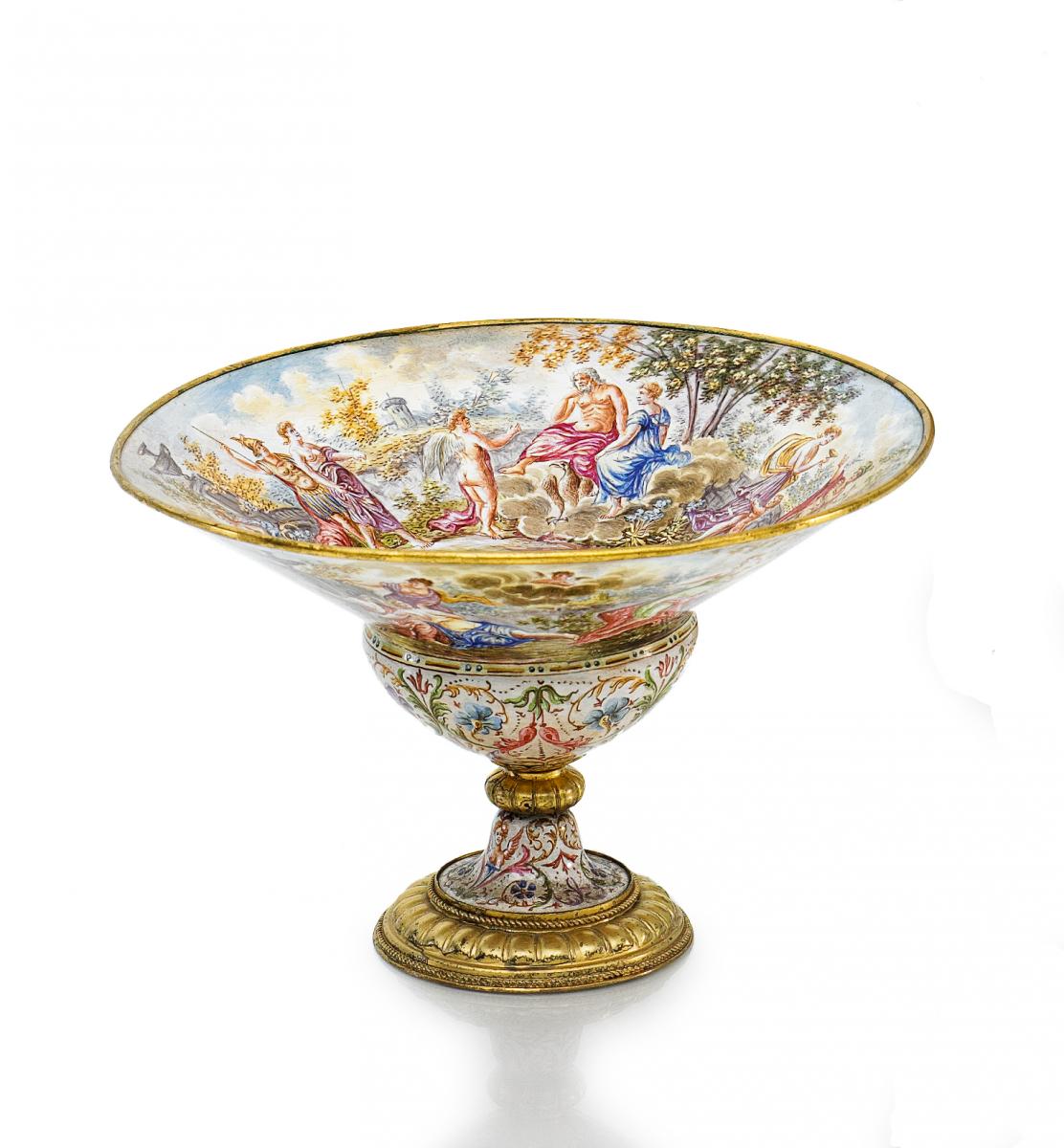 Silbermontierung vergoldet. Metall mit farbigem Emaildekor. Auf Rundfuß trichterförmige Schale. Oberfläche allseitig bedeckt mit antikisierendem