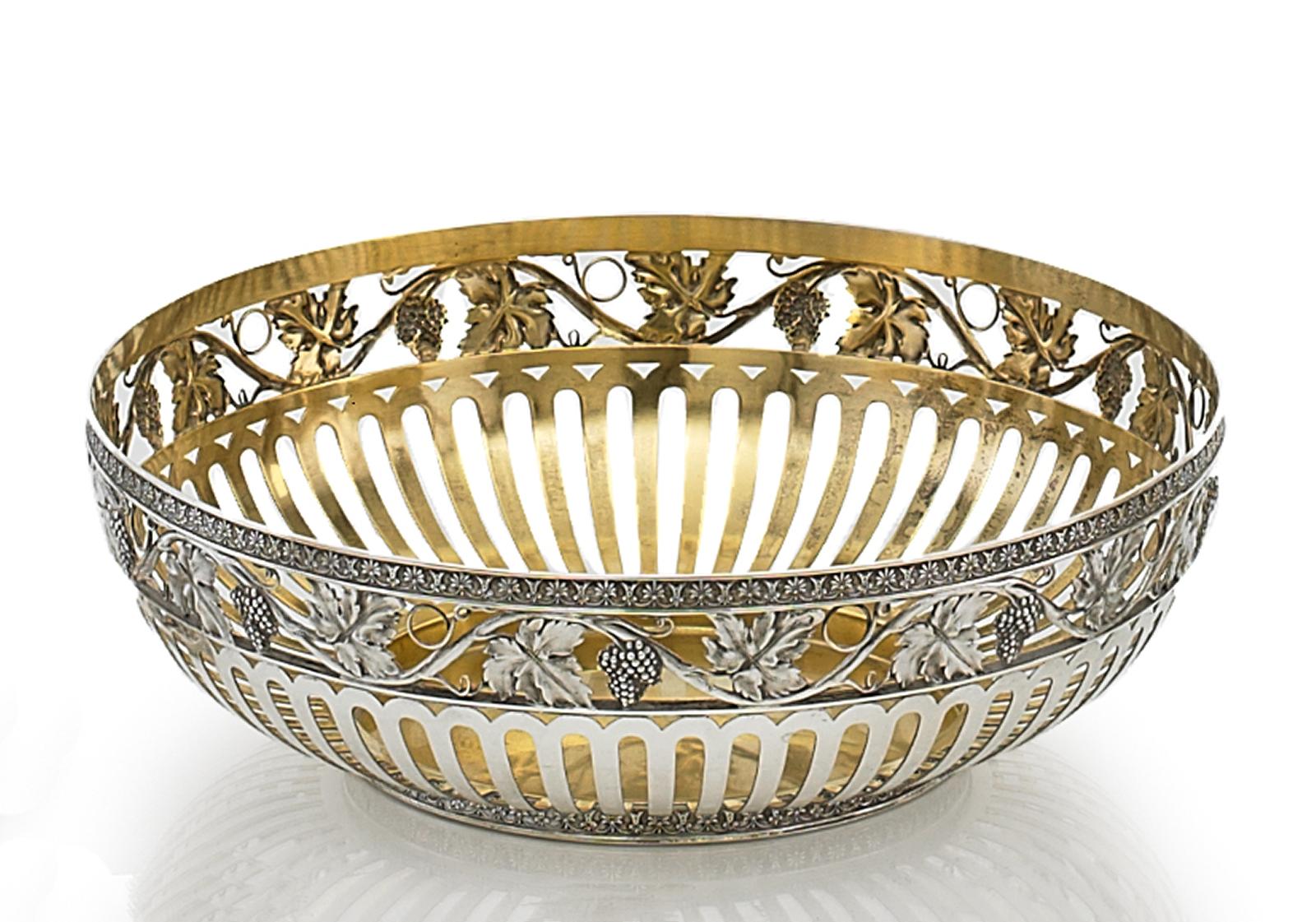 Silber mit Innenvergoldung. Höhe 9cm, Ø 28,5cm. Ca. 767g. Zustand A.