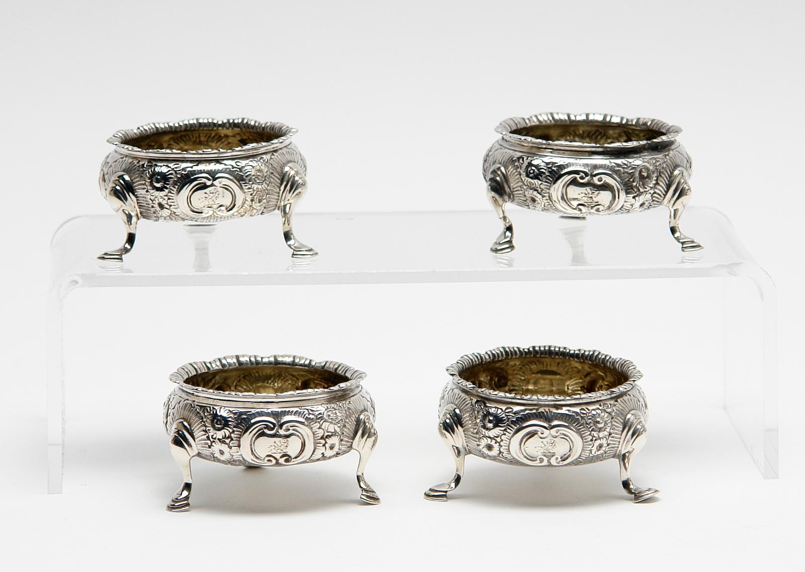 Satz von vier George III Gewürzgefäßen. London. 1761/62 bzw. 1762/63. Zweimal William Cripps. Silber. Innenvergoldung. In Rocaillekartusche je heraldische Gravur mit steigendem Pferd. Höhe 4cm, Ø 6,5cm. Ca.217g. Zustand A-B. ...