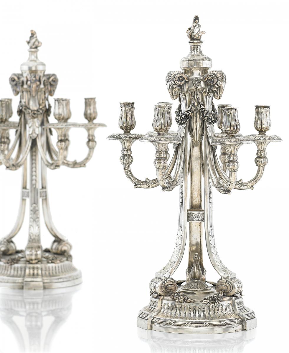 plastischen Widderköpfen endend. Die sechs geschwungenen Leuchterarme mit zylindrischen