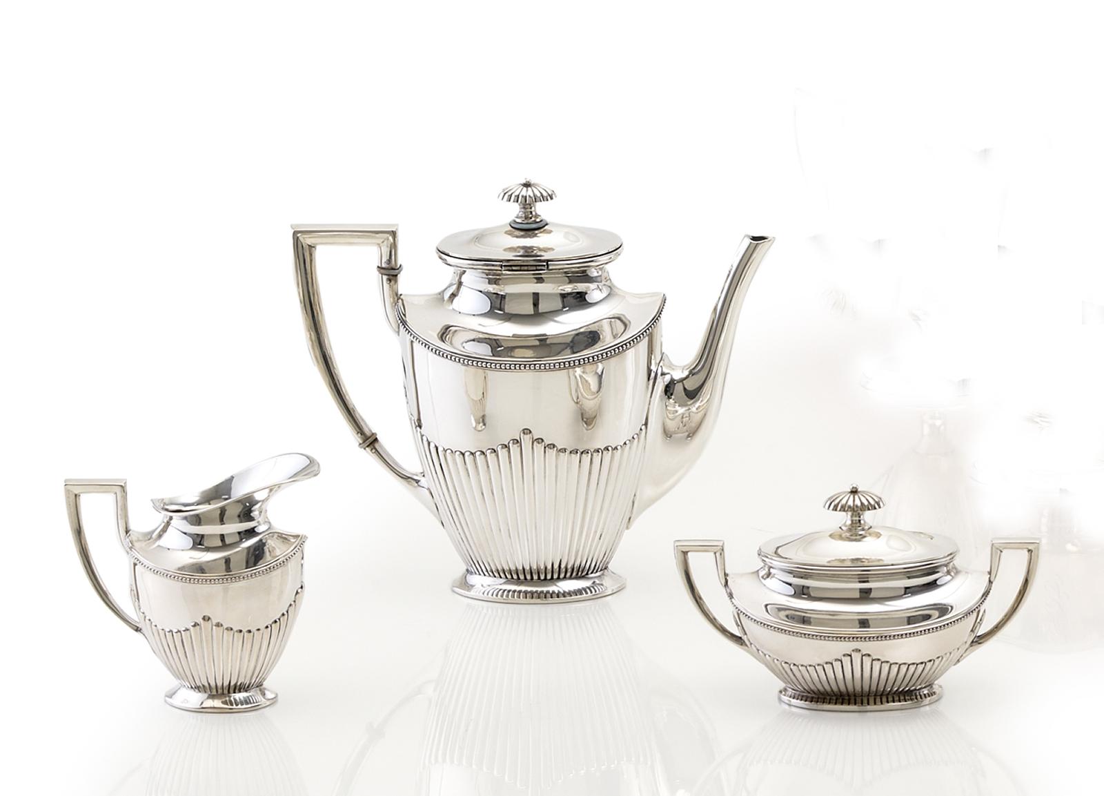 Teekanne, Milchgießer und Zuckerschale. Höhe 21cm. Ca. 978g. Zustand A.