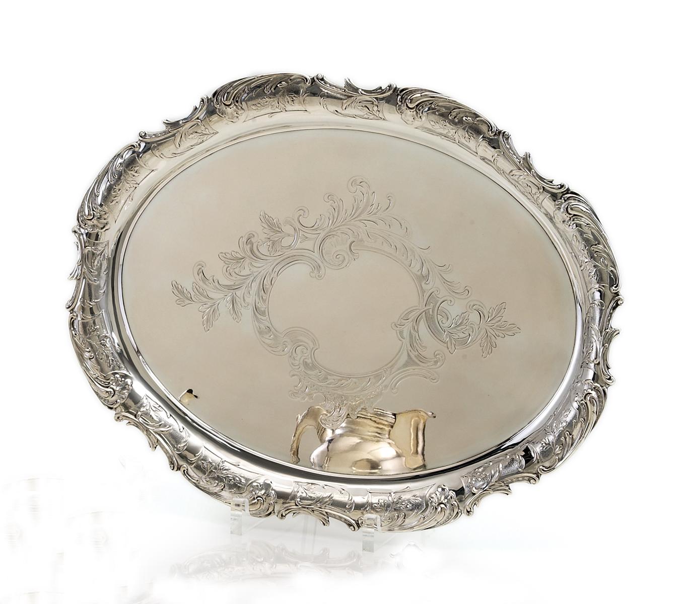 Silber. Reliefierter Rand mit C-Schwüngen und Blättern. Im Spiegel gravierte Rocaillekartusche