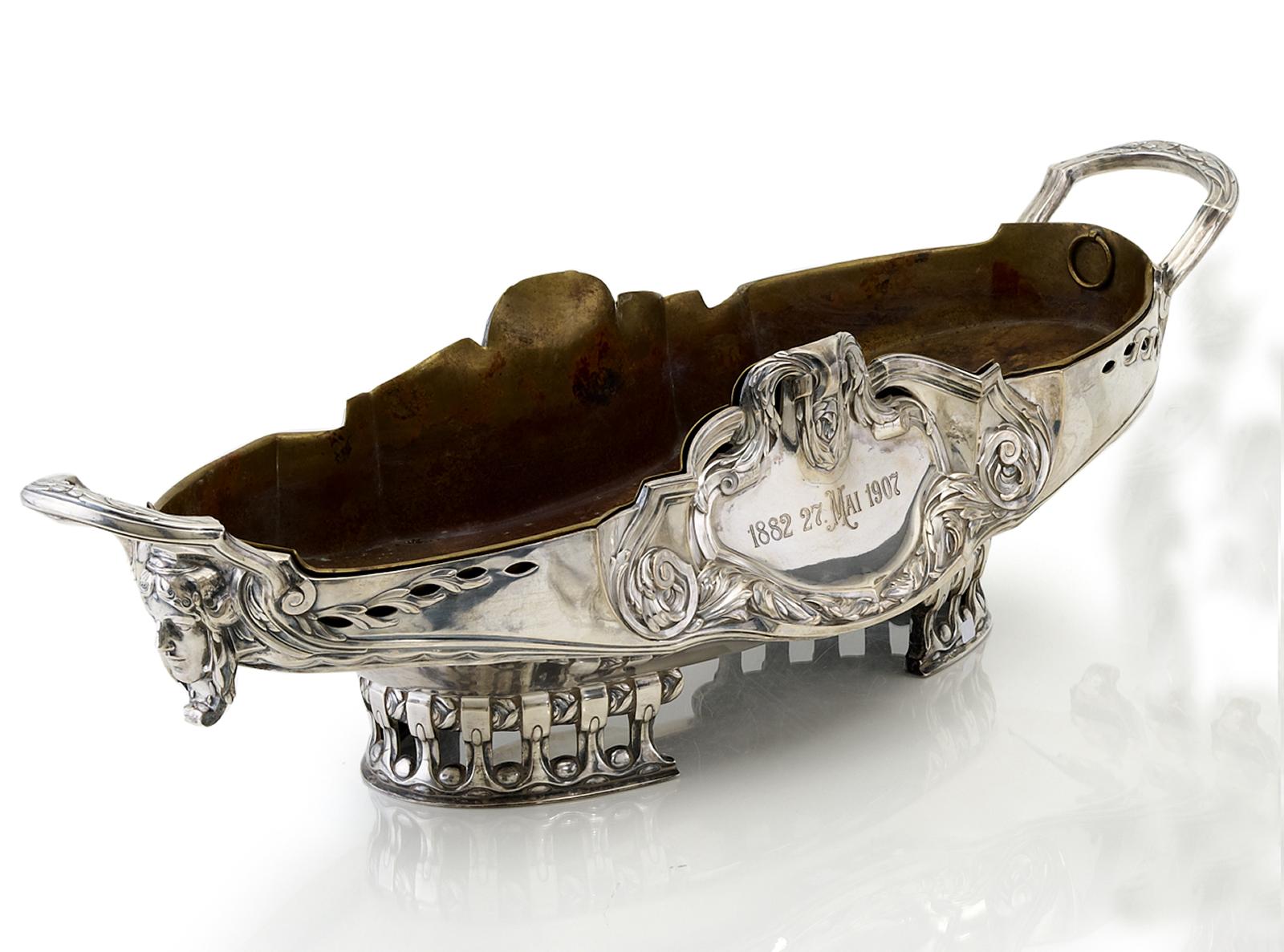 Silber. Messingeinsatz. In zentraler Kartusche auf Wandung einmal Monogramm F.S.B. [lig.] und '1882 27.Mai 1907'. Höhe 19,5cm, Länge 76cm. Ca. 2240g. Zustand A/B.