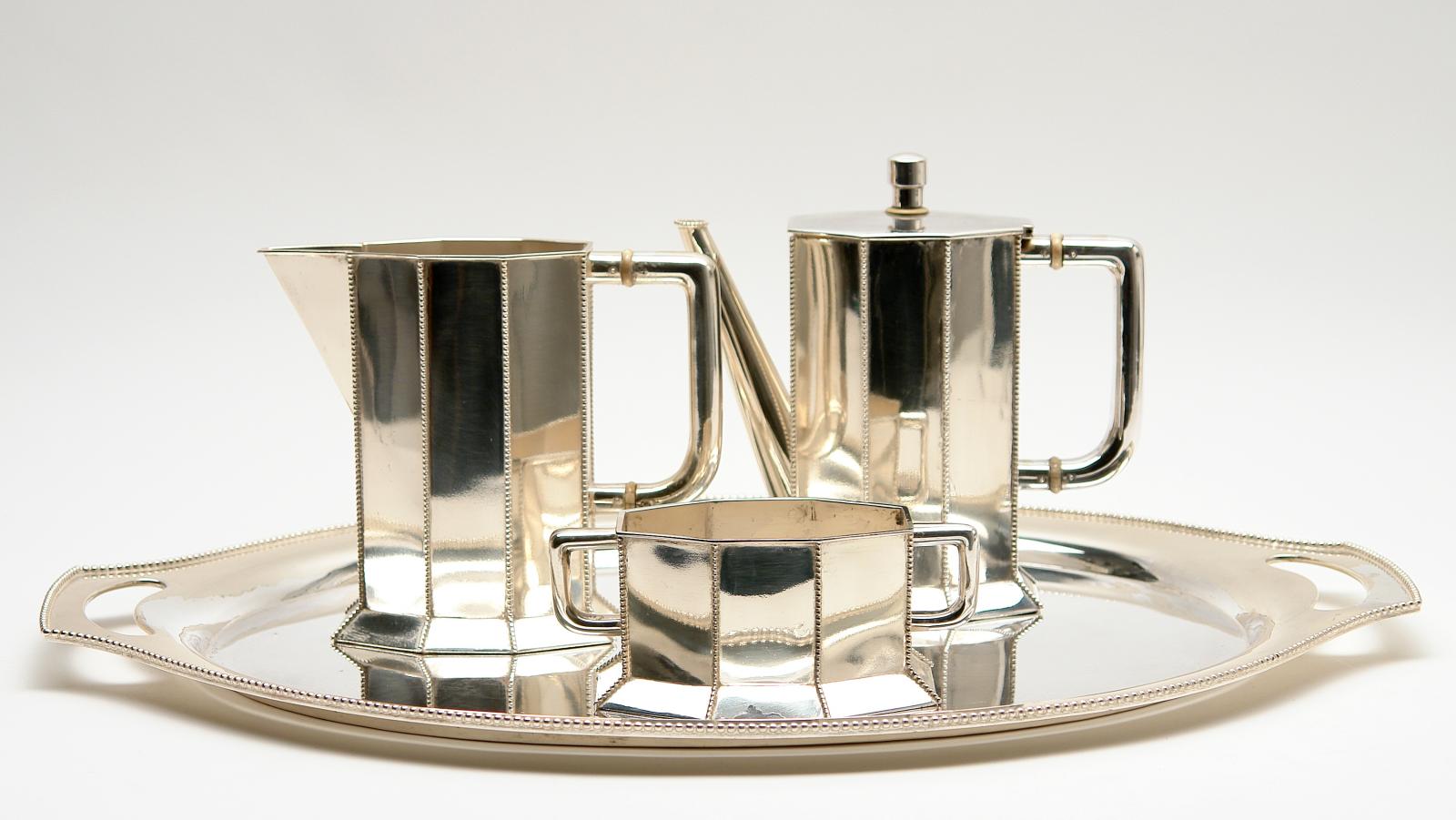 Silber. Polygonale Wandung, die Kanten mit Perlbandrelief abgesetzt. Bestehend aus Kaffeekanne,