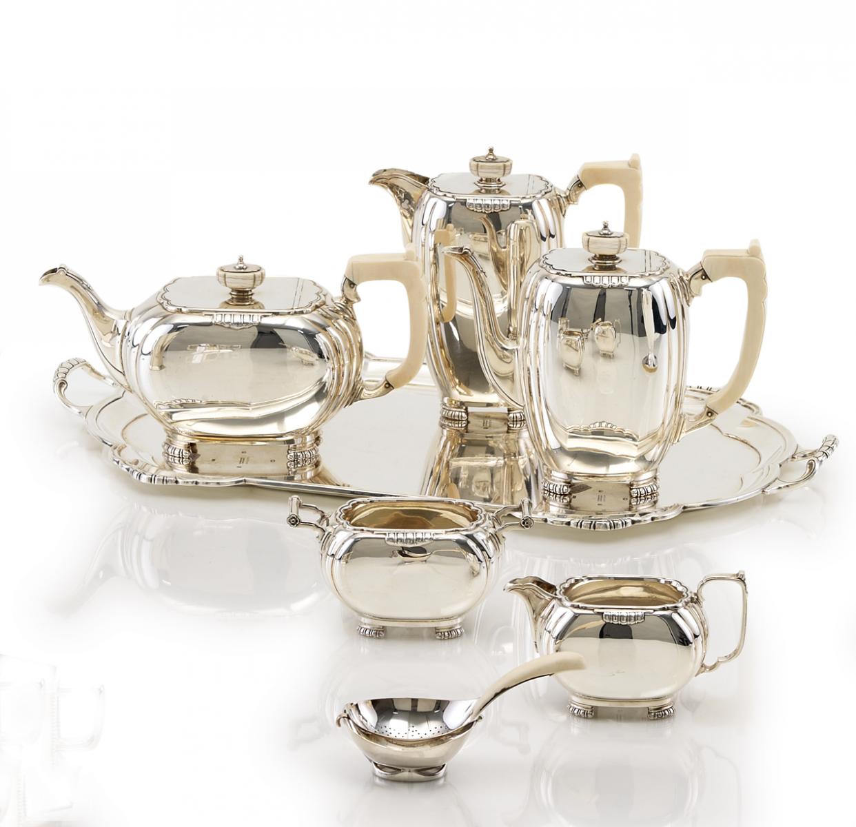 Teekanne, Heißwasserkanne, Zuckerschale, Milchgießer und Tablett. {Beil.:} Teesieb mit