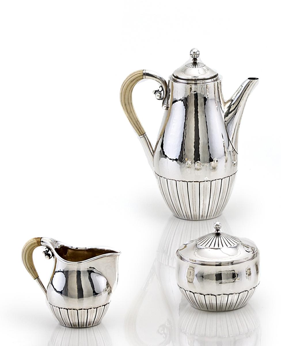 Silber. Kannelierte Elfenbeingriffe. Bestehend aus Kaffeekanne, Zuckerdose und Milchgießer. Höhe der Kanne 18cm. Ca. 691g. Zustand A.
