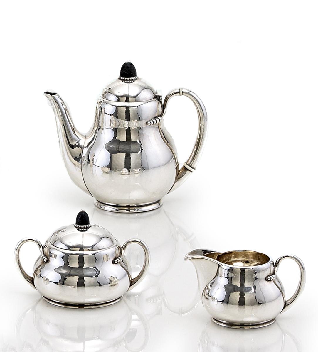 Silber. Holzknauf. Bestehend aus kleiner Kaffeekanne, Milchgießer und Zuckerdose. Höhe der Kanne 14cm. Ca. 610g. Zustand A.