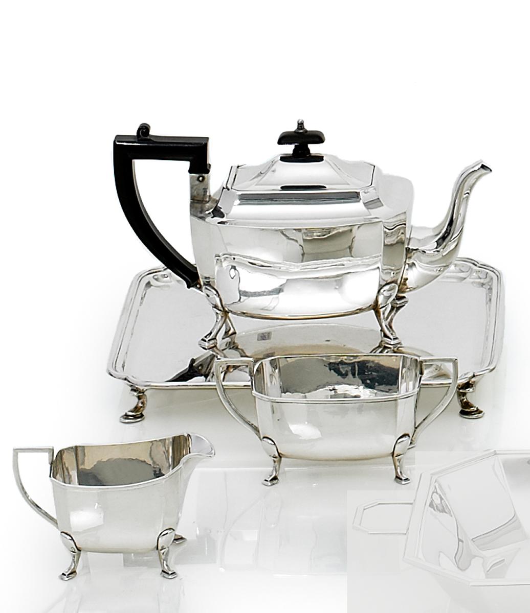 Silber. Knauf und Henkel ebonisiertes Holz. Bestehend aus Teekanne, Zuckerschale und Milchgießer. Höhe der Kanne 14,5cm. {Beil.:} Großer Salver. Sheffield. Mappin & Webb. Ca. 1036/864g. Zustand A/B.