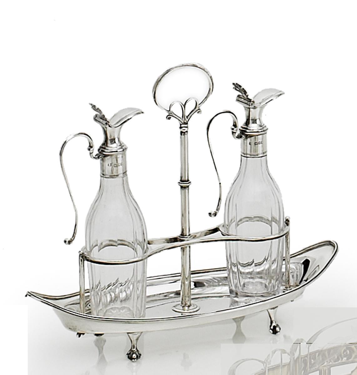 Silber. Geschnittenes Kristallglas. Mit zwei Karaffen. Höhe 23,5cm, Länge 28,5cm. Ca.349g. Zustand A/B.