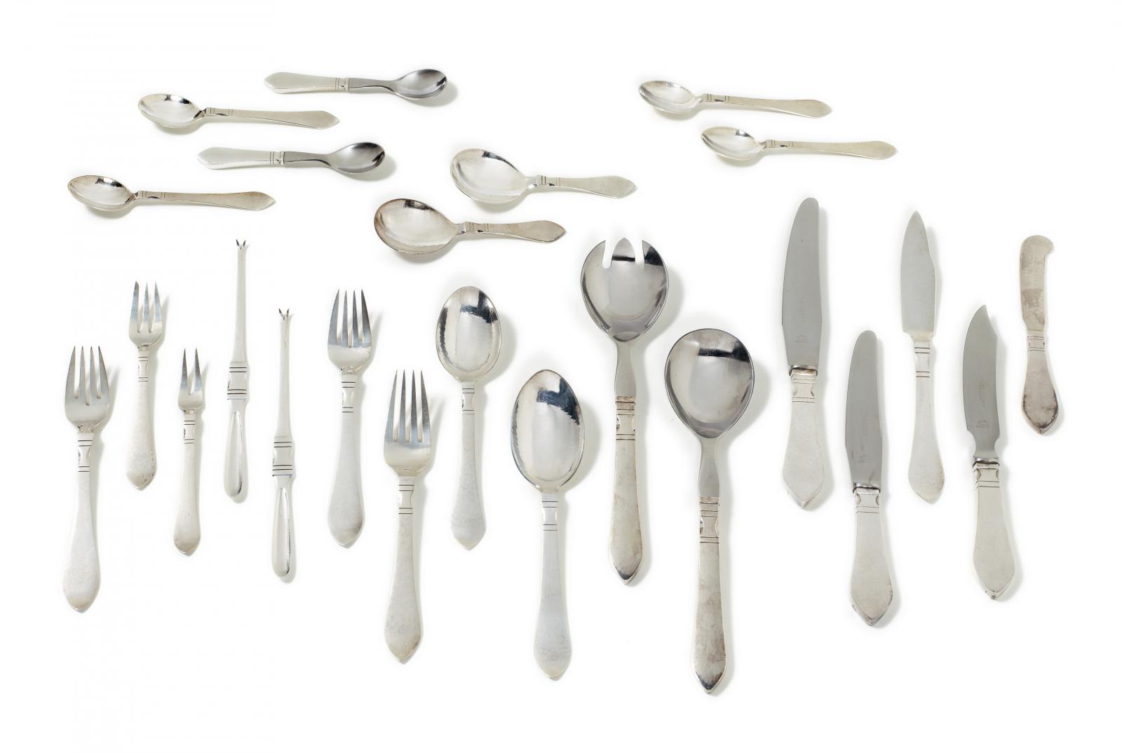 Kuchengabeln, Eierlöffel, elf Kaffeelöffel, neun Hummergabeln, zwölf Vorlegeteile. Ca. 5.176g. Zustand A.