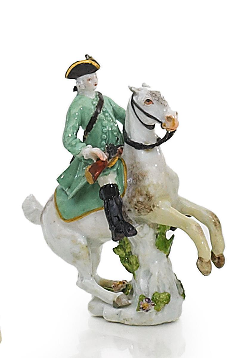 Kleiner Jagdreiter mit türkisem Rock und Sattel.