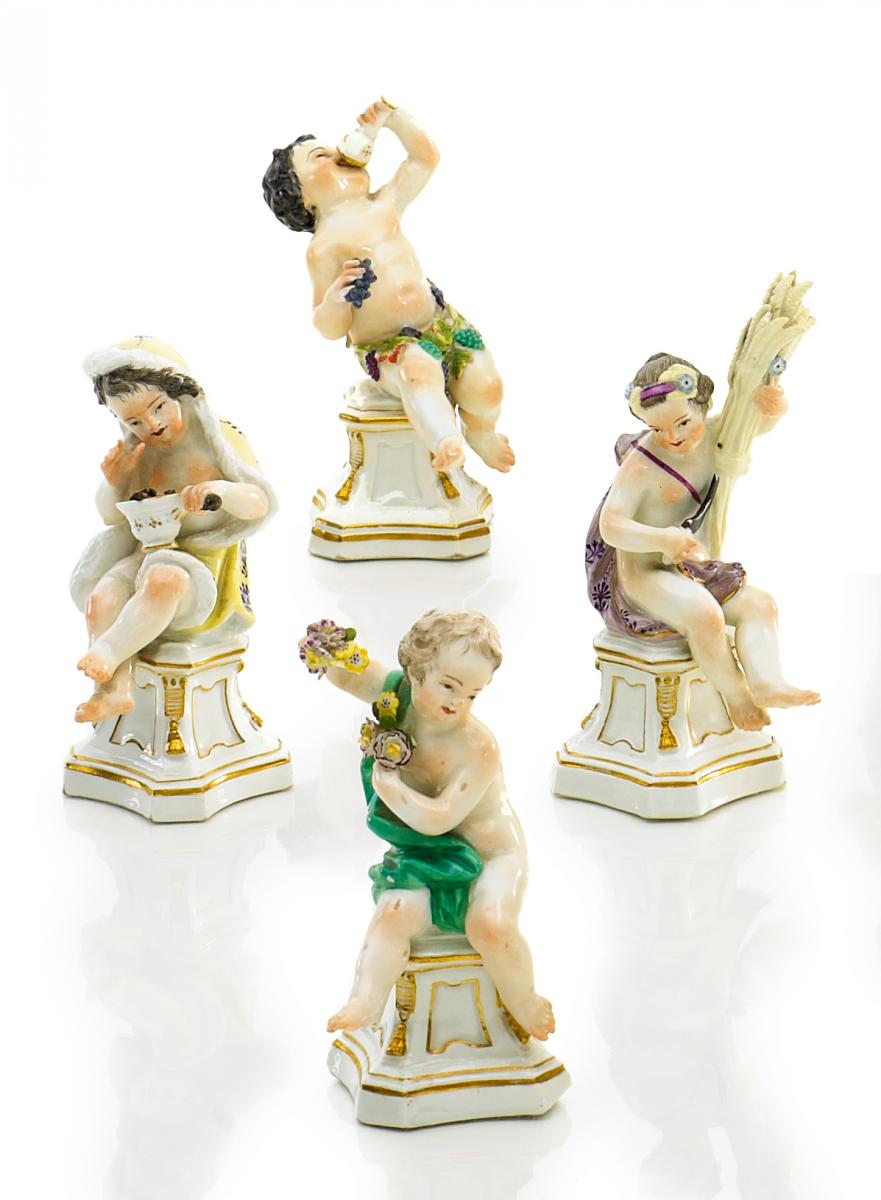 Porzellan, farbig und gold staffiert. Auf Sockel sitzend je ein Putto mit den Attributen der verschiedenen Jahreszeiten. Höhe 13/13,5/14,5cm. Zustand A/B-B.
