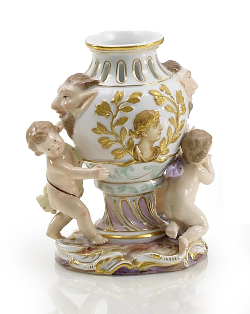 Porzellan, farbig und gold staffiert. Kleine Vase mit Faunköpfen und antikem Profilbildnis auf Rocaillesockel, umringt von drei