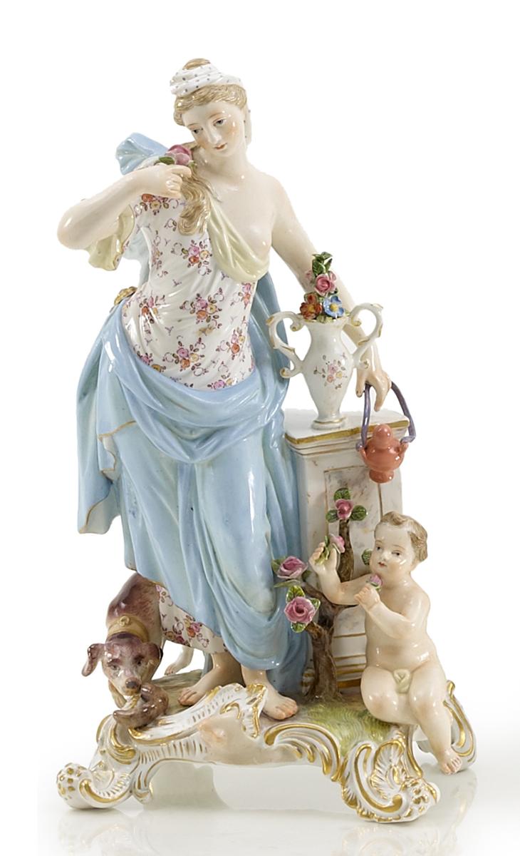 Porzellan, farbig und gold staffiert. Auf Rocaillesockel stehende Frau in antikisierendem Gewand mit Attributen des Geruchsinns. Höhe 27cm. Zustand C.