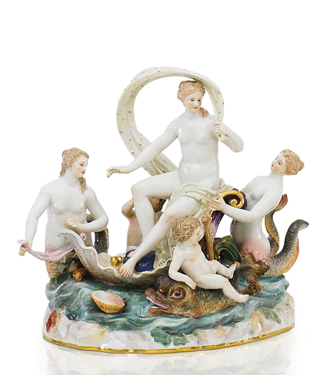 Porzellan, farbig und gold staffiert. Amphitrite in Muschelwagen mit hellgelbem Tuch. Höhe 23,5cm. Zustand C.