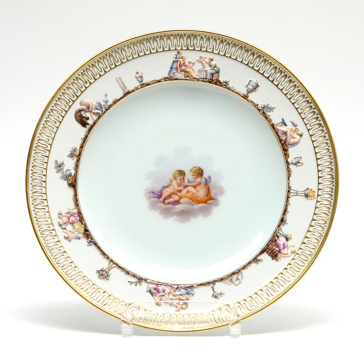 Porzellan, farbig und gold staffiert. Im Spiegel zwei Amoretten mit Taube. Auf der Fahne reliefierte mythologische Szenen. Ø 23cm. Zustand A.