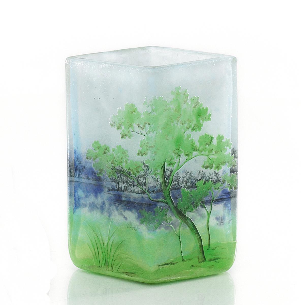 Farbloses Glas, in Schichten flockig in Grün, Dunkelblau und Hellblau überfangen. Außen geätztes Dekor mit Bäumen und Gräsern, farbig emailbemalt. Höhe 10cm. Zustand A.
