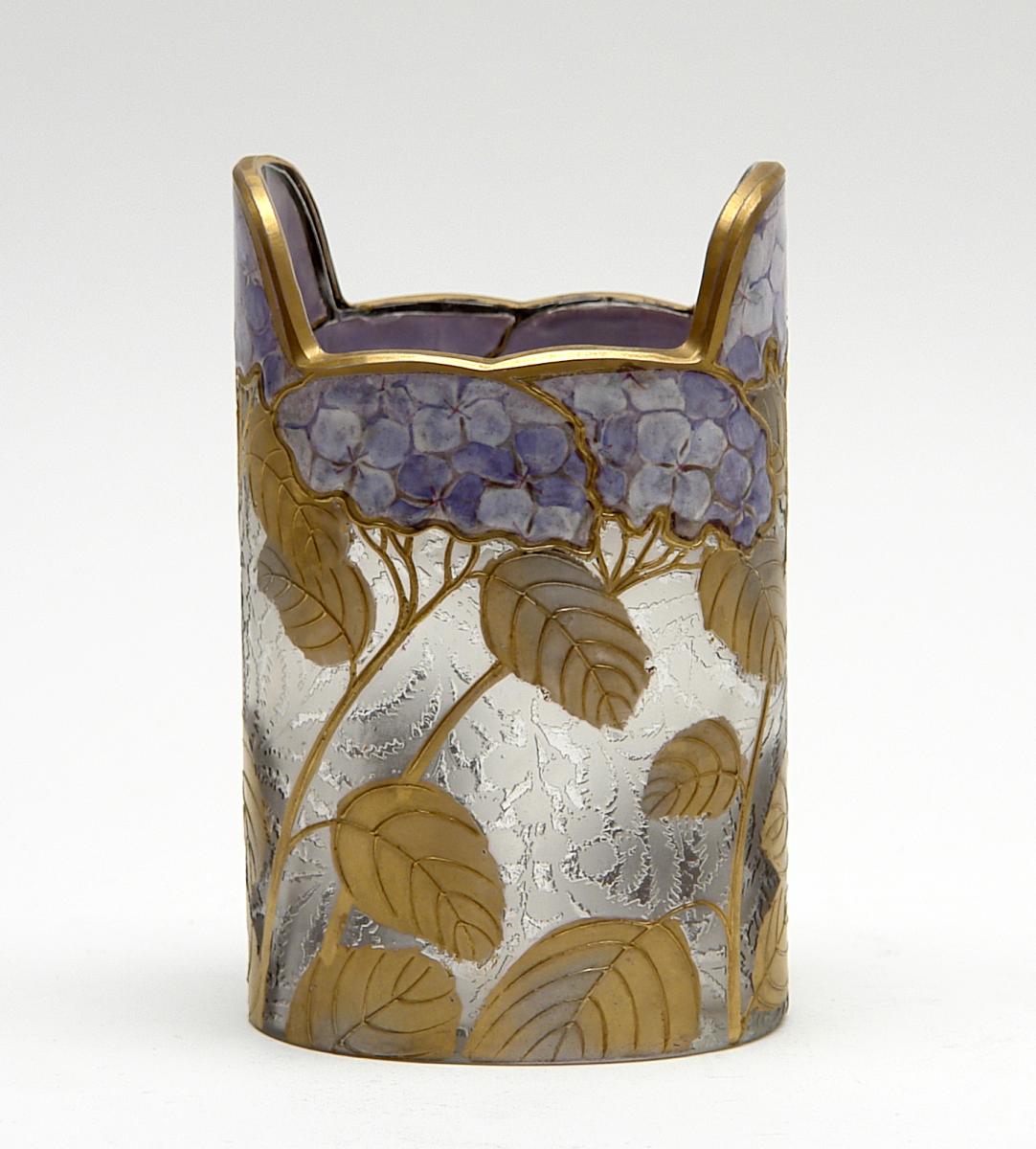 Farbloses Glas, geätzt, emailliert und vergoldet. Höhe 16cm. Zustand A.