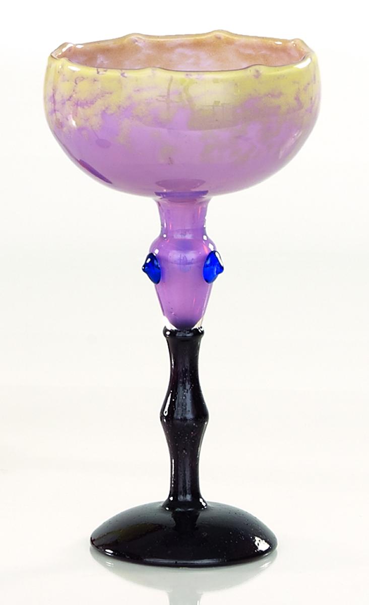 Farbloses Glas mit fliederfarbener Pulvereinschmelzung, an Lippenrand flockig zitronengelb. Der Fuß violett, die drei Nuppen des Schaftes blau. Höhe 19,5cm. Zustand A.