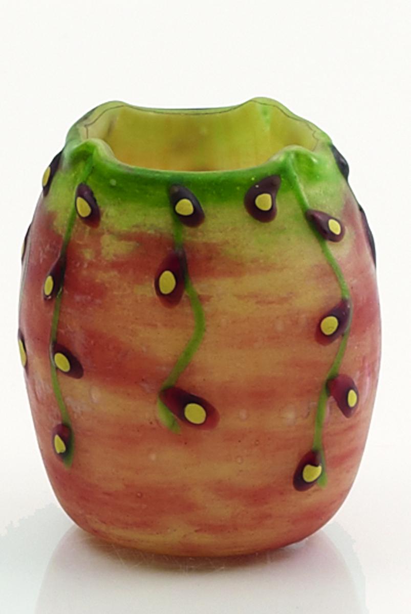 Farbloses Glas mit streifig gelben Einschmelzungen, außen orangefarbene nach oben in Grün übergehende Aufschmelzung. Vor der Lampe heiß appliziertes rankenförmiges Dekor. Mattgeätzt. Höhe 6cm. Zustand A.