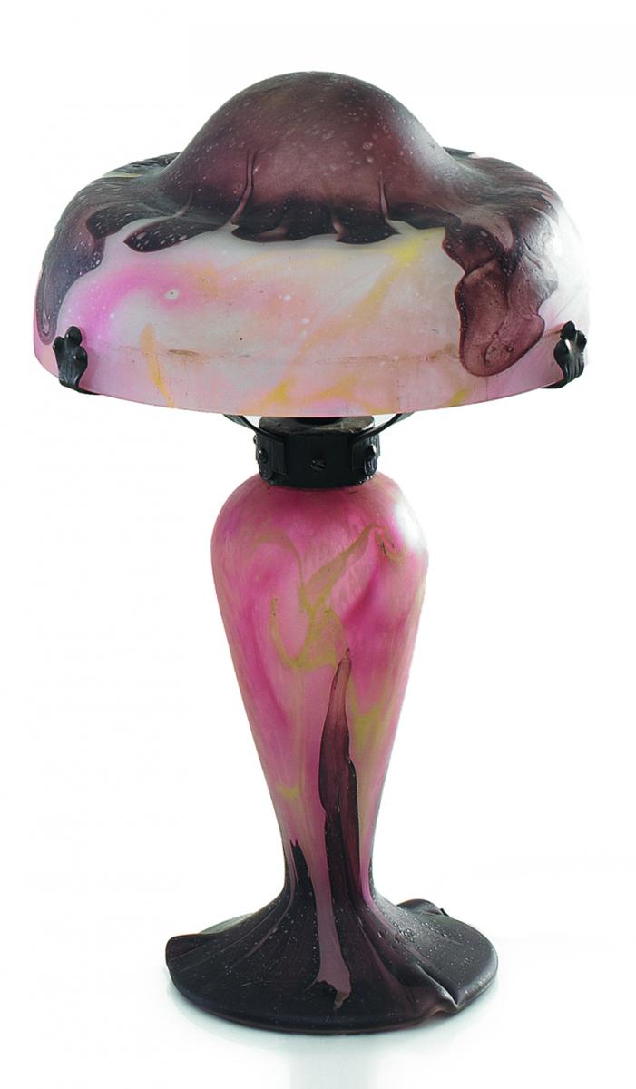 Farbloses Glas mit schlierig rosafarbenen, gelben sowie violetten Pulvereinschmelzungen. Mattgeätzt. Schmiedeeiserne Montierung. Höhe 42cm. Zustand A/B. Elektrifiziert.