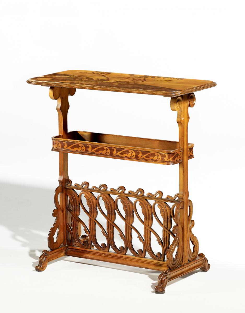 Nussbaum, Ahorn, Ebenholz intarsiert und tlw. grün gefärbt. Reich floral intarsierte Platte auf verstrebten Stützen mit üppigem Schnitzdekor. 77x70x38cm. Zustand B/C. Sign. 'Gallé'.