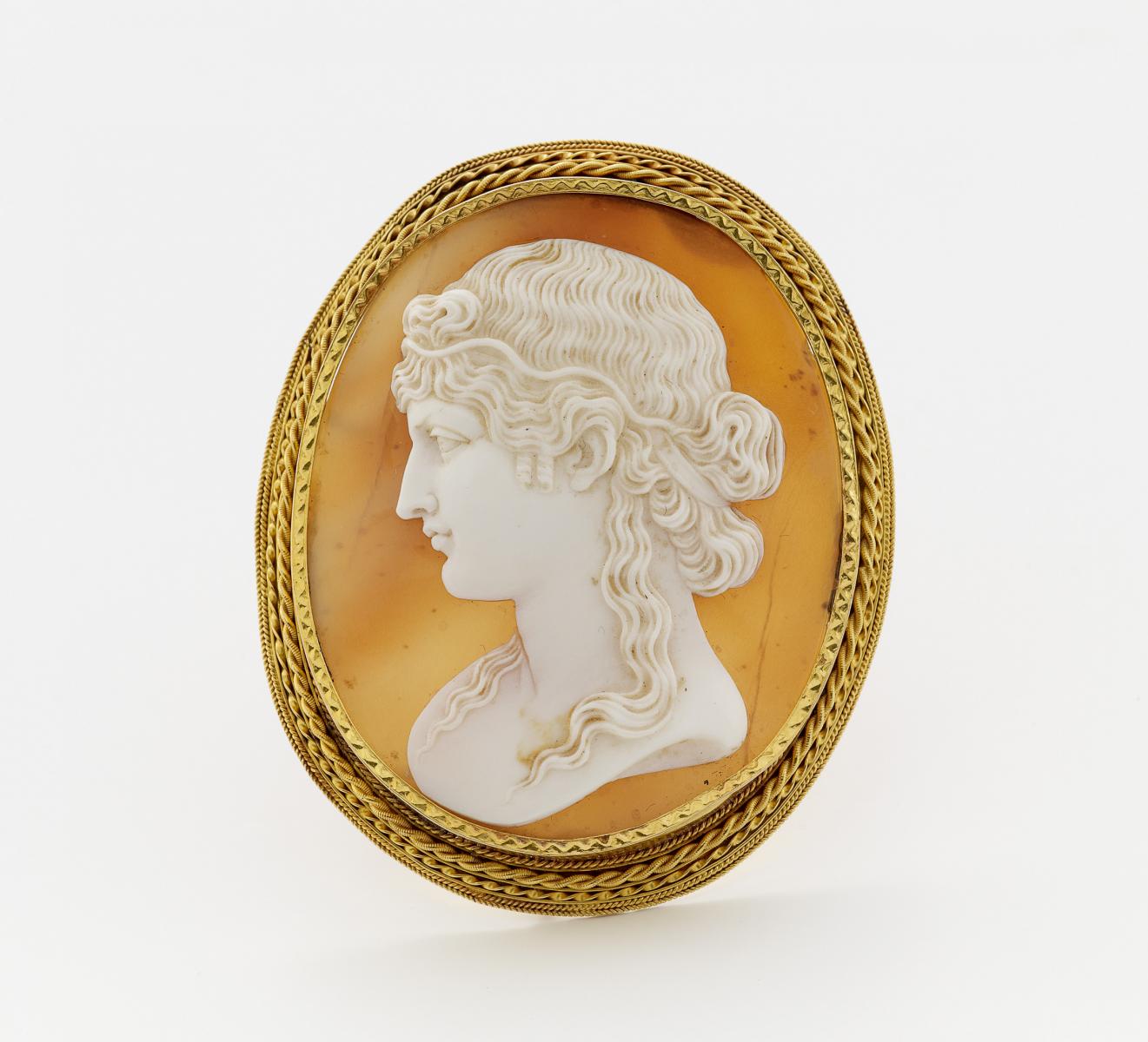 625/- Gelbgold, Gewicht: 17,1g. 1 Muschel-Kameeschnitt (Meeresschnecke) ca. 5 x 4,1cm, (zarte Haarrisse),