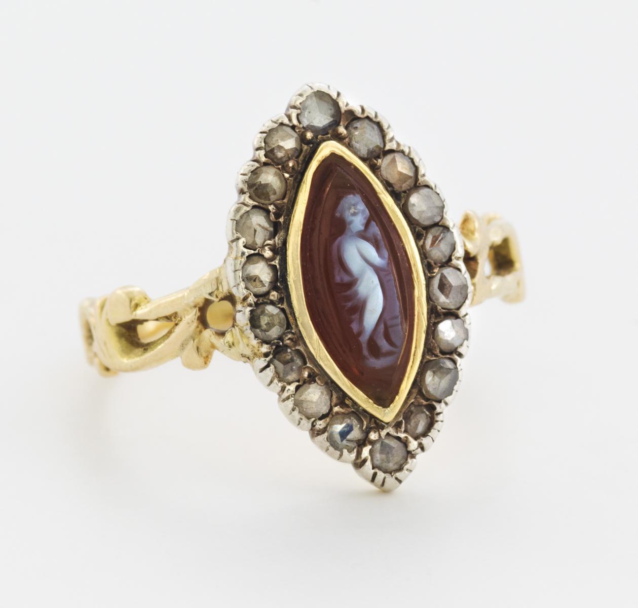 585/- Gelbgold, Silber, Gewicht: 3,1g. 1 geschnittener Karneol mit Frauenkamee D. 11 x 5mm, 18 folierte Diamantrosen zus.ca. 0,09ct, EU-RM: 57. Ringtop: 13 x 11mm. Die ältesten Steinschnitte entstanden im 5. bis 3. Jahrtausend vor Christus.