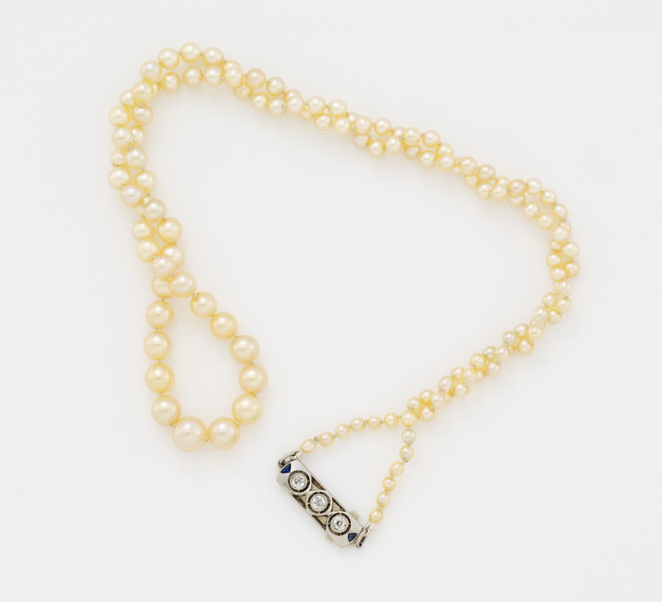 750/- Weißgold, Gewicht: 12g. 2 winzig blaue Saphire im Fancyschliff, 3 Altschliff-Diamanten zus.ca. 0,15ct, 127 Natur Salzwasser-Perlen (Orient) rund-unrund-leicht oval, D. ca. 2,46 - 6,56mm, Körperf.: hellcreme, Überf.: hellgelb-rose,