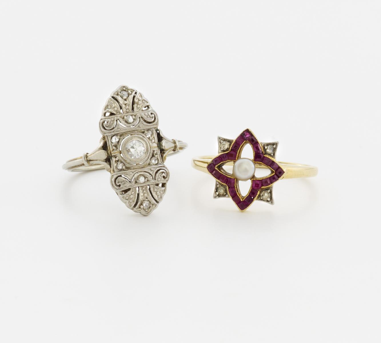 Konvolut: Art Deco. Zwei Ringe mit Diamant-Rubin-Perlbesatz.