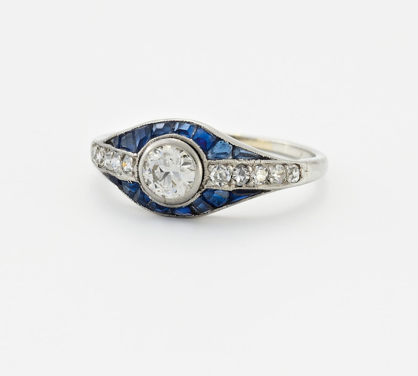950/- Platin, rhodiniert, Gewicht: 2,4g. 16 blaue Saphire im Fancyschliff zus.ca.0,40ct, 1 Diamant im Übergangsschliff ca. 0,25ct, Tchry(I)VS, 10 8/8 Diamanten zus.ca. 0,12ct, EU-RM: 50. Innseitige Gravur: Edmond a Eva, 30 Juin 1931.